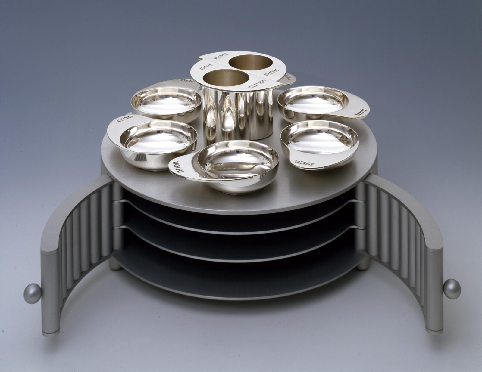 צלחת פסח PS-10, היחידה בעלת שני גביעים, האחד כוסו של אליהו הנביא והאחר כו של מרים הנביאה, עבודת יד, כסף. המגשים עשויים אלומיניום