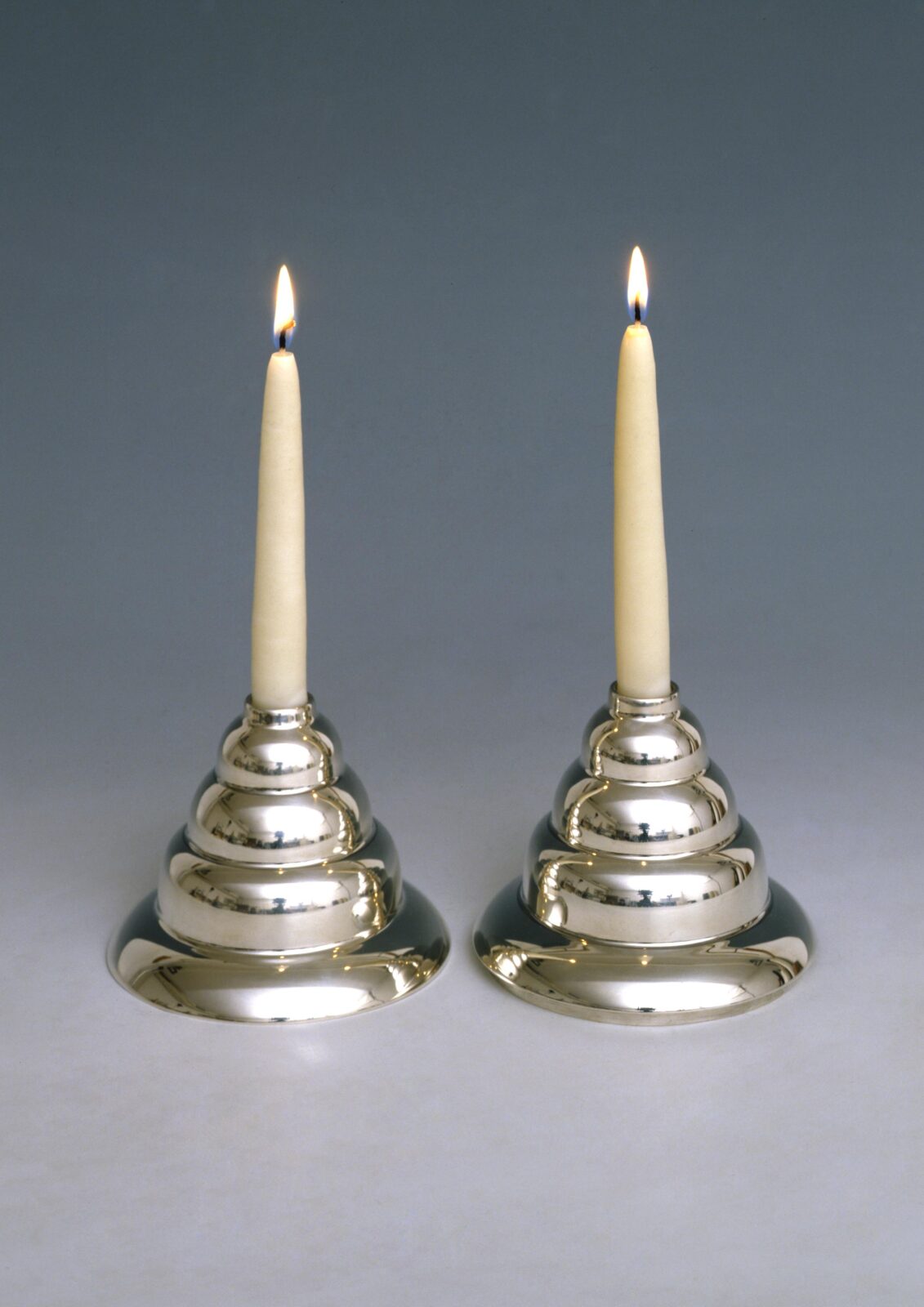 Etrog Box EB-04, with a handle. Can be used also as a pair of candlesticks. Hand made of sterling silver and anodized aluminum, H-9”